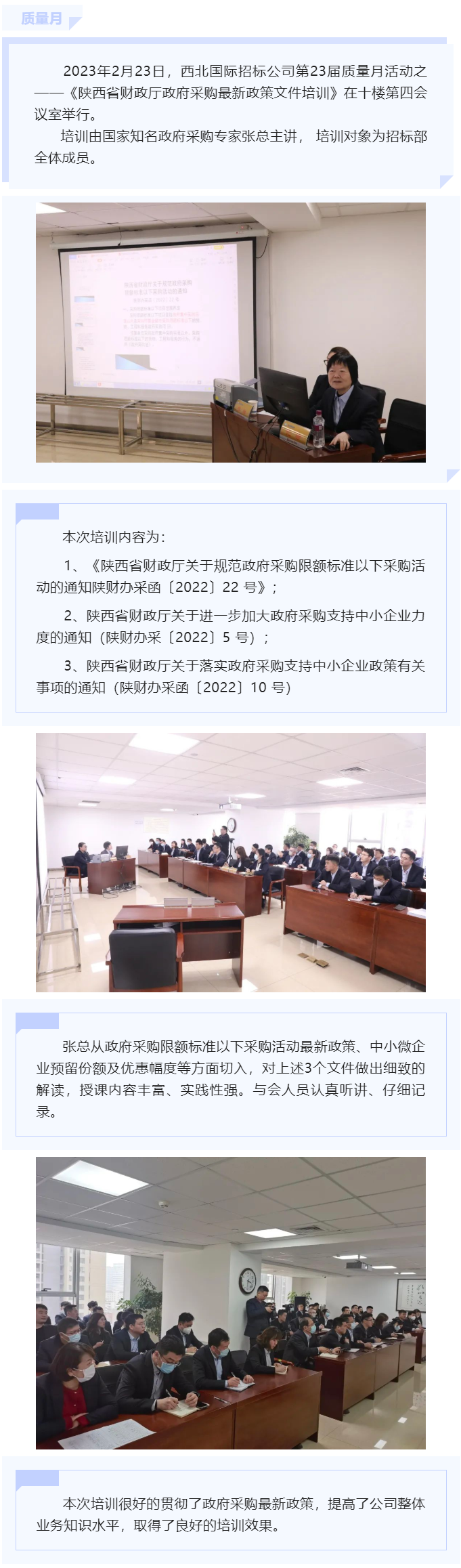 西北國(guó)際招標(biāo)公司第23屆質(zhì)量月活動(dòng)之——《陜西省財(cái)政廳政府采購(gòu)最新政策文件培訓(xùn)》
