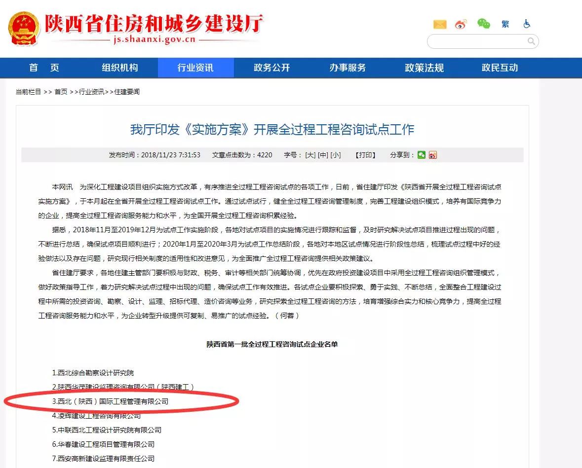 西北(陜西)國際工程管理有限公司入選陜西省住建廳第一批全過程工程咨詢試點企業(yè)名單