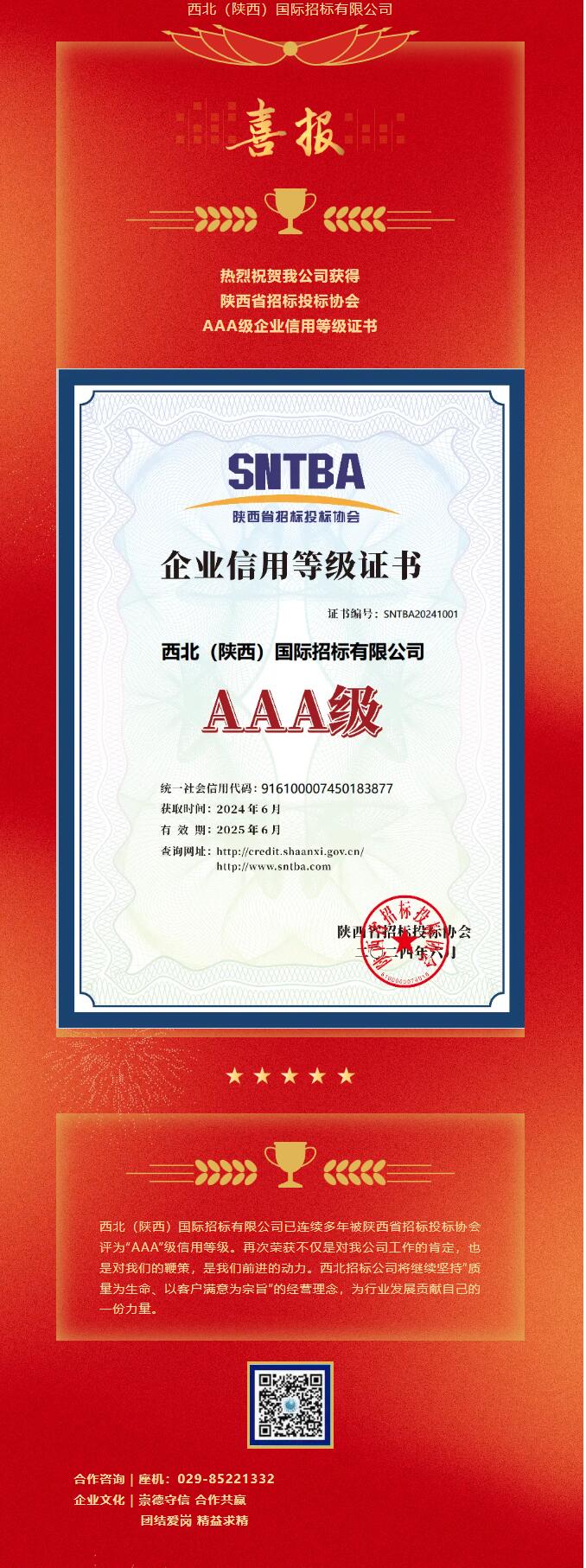 熱烈祝賀我公司獲得陜西省招標(biāo)投標(biāo)協(xié)會AAA級企業(yè)信用等級證書