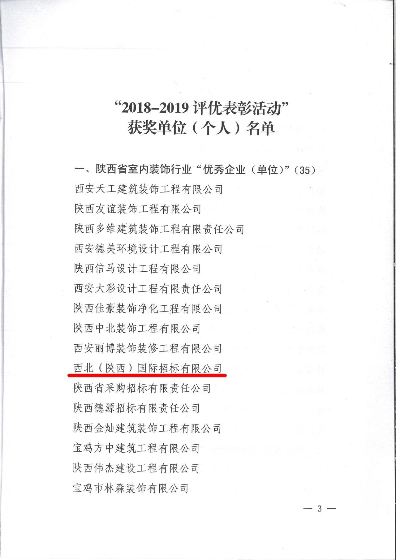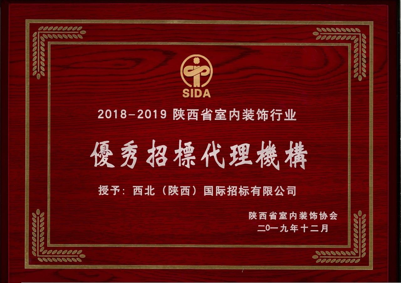 2019年12月26日,“陜西省室內(nèi)裝飾協(xié)會六屆三次理事會暨2018-2019行業(yè)表彰大會”在古都西安召開,我公司被陜西省室內(nèi)裝飾協(xié)會評為2018-2019陜西省室內(nèi)裝飾行業(yè)“優(yōu)秀招標(biāo)代理機(jī)構(gòu)”