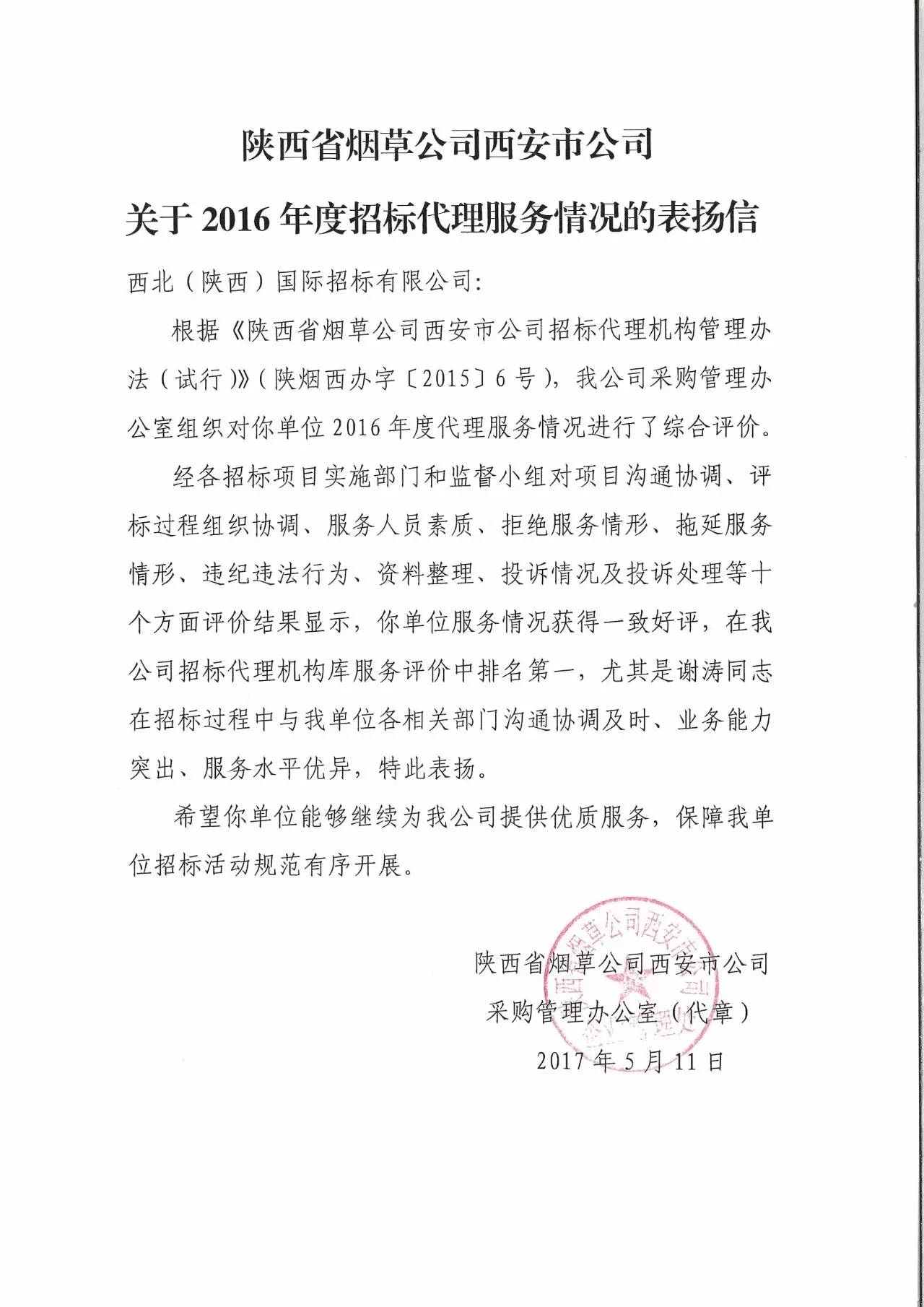 近日,我公司收到陜西省煙草公司西安市公司發(fā)來的表揚信。經(jīng)過綜合評價,我公司被評為西安市煙草公司2016年度招標(biāo)代理服務(wù)評價第一名。對我公司代理服務(wù)給予積極評價,對謝濤同志的工作給予熱情肯定!
