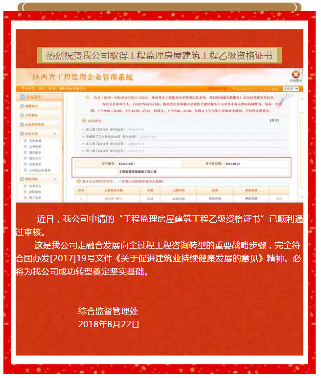熱烈祝賀我公司取得工程監(jiān)理房屋建筑工程乙級資格證書