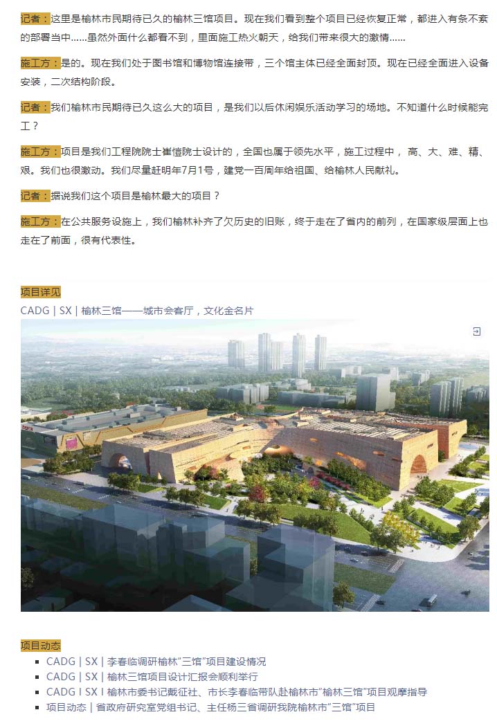 最近,榆林市最大的公共設施類項目,圖書館、博物館、展覽館三館項目即將封頂。該項目占地約300畝,總建筑面積22.7萬平方米,總工程造價24 億元。建成后將成為榆林市的城市會客廳,城市金名片。
