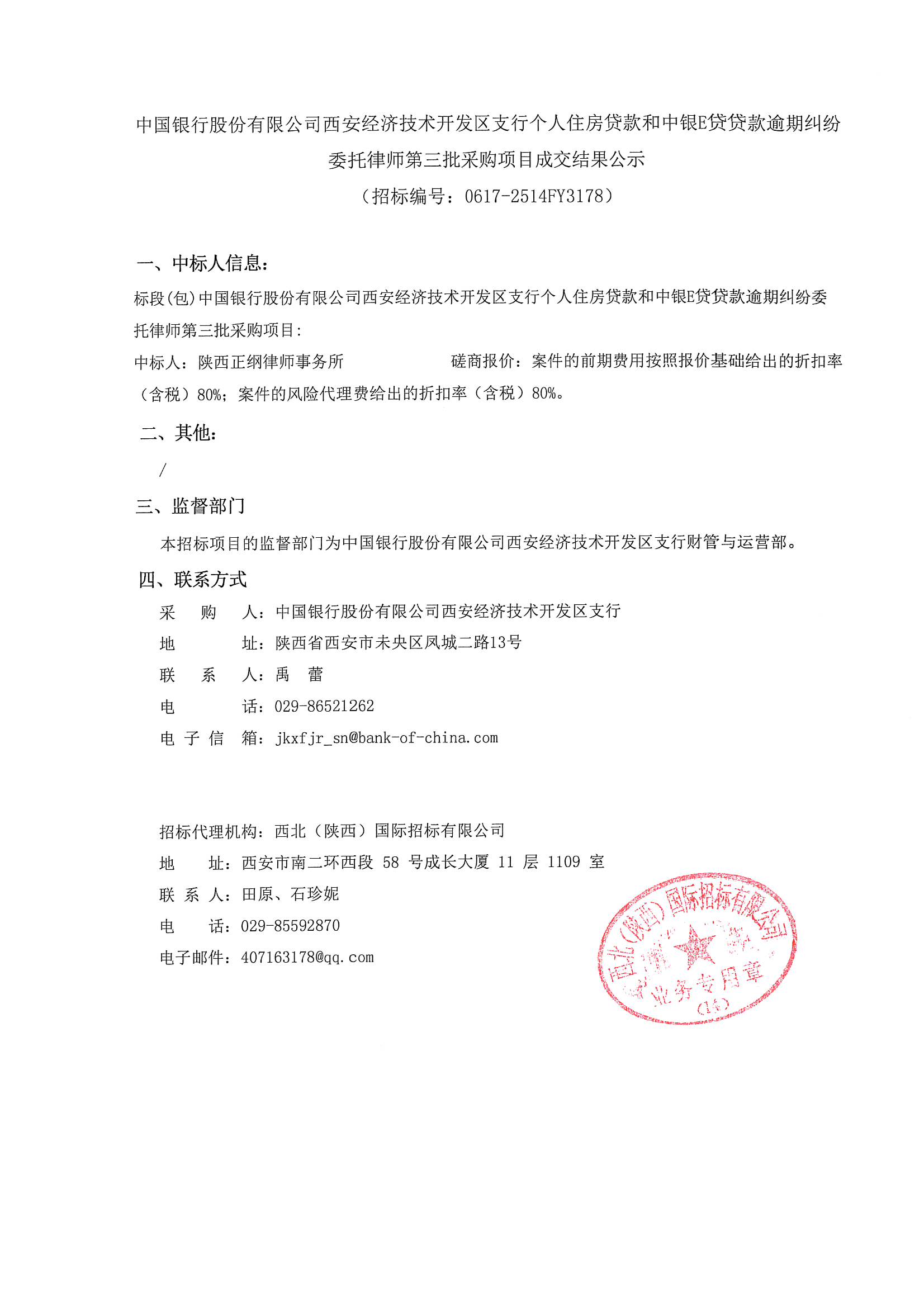 中國銀行股份有限公司西安經(jīng)濟(jì)技術(shù)開發(fā)區(qū)支行個(gè)人住房貸款和中銀E貸貸款逾期糾紛委托律師第三批采購項(xiàng)目成交結(jié)果公示